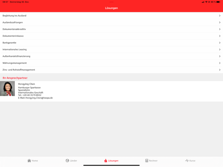 Neben den Produktinformationen gibt die neue Rubrik der S-Lösungen einen tiefen Einblick in das Netzwerk des S-CountryDesk. So werden die Deutsche Leasing als Partner für internationales Leasing und S-Treasury Mittelstand zur Abwicklung des Währungsmanagements erläutert.
