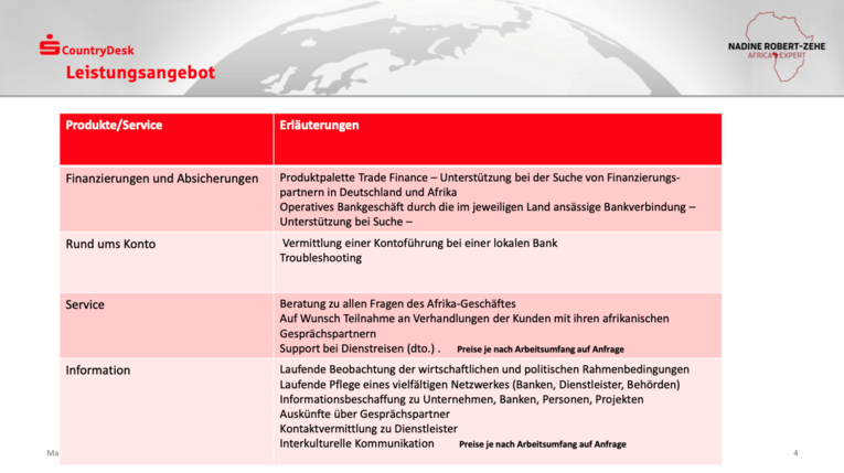 Diese Begleitung beginnt bei allgemeiner Informationsbeschaffung und setzt sich über die Vermittlung von Dienstleistern und die Unterstützung bei der Anbahnung lokaler Bankverbindungen bis hin zur Begleitung klassischen, operativen Bankgeschäftes fort. Abgerundet werden die Möglichkeiten durch individuelle Serviceleistungen, die z.B. in Support bei Dienstreisen oder der Teilnahme an Verhandlungen unserer Kunden mit afrikanischen Geschäftspartnern bestehen können.