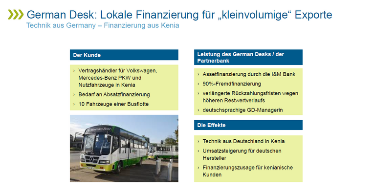 Wie die Unterstützung in der Praxis aussehen kann, stellte Christoph Tilkorn abschließend anhand einiger Praxisbeispiele vor, so z.B. der Finanzierung einer Busflotte in Kenia.
