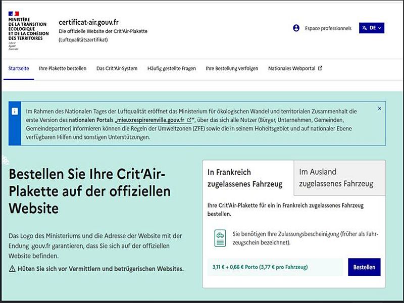 Aufruf der Internetseite CritAir unter: www.certificat-air.gouv.fr