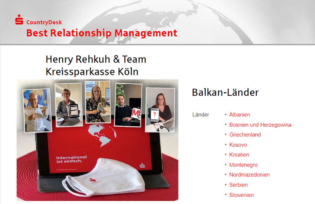 Michael Kompa stellte in seiner Laudatio die breite Aufstellung des ausgezeichneten RM-Teams mit der Betreuung von gleich neun Ländermandaten heraus. Darüber hinaus engagiert sich das Team beim Aufbau neuer Netzwerkbeziehungen (Deutsche Investitions- und Entwicklungsgesellschaft; Maier + Vidorno) und bei der Pflege langjähriger Partnerschaften (ERSTE Group, Raiffeisen Bank International). Das Engagement der Preisträger geht zudem über die üblichen RM-Aufgaben hinaus. Insbesondere in den Arbeitskreisen des S-CountryDesk bringt sich das Team durch seine Mitarbeit zum Nutzen aller ein, so z.B. in den Arbeitskreisen „Strategie“ und „Marketing“.