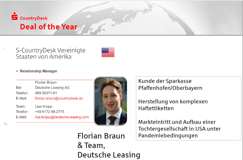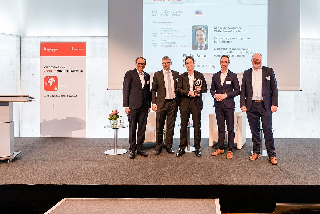 Mit dem S-CountryDesk Award in der Kategorie „Deal of the year“ wurden Florian Braun & Team von der Deutsche Leasing AG ausgezeichnet. Laudator Patrick Beyer (Geschäftsführer S-CountryDesk GmbH) beschrieb das prämierte Geschäft als Vorzeigebeispiel dafür, was der S-CountryDesk für Kunden seiner Nutzersparkassen leisten kann.