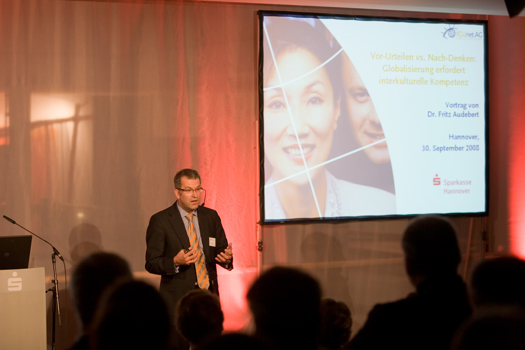 Am 30.09.2008 lud die Sparkasse Hannover ihre Kunden zum Thema interkulturelle Kompetenz ein. In exotischer Atmosphäre wurden die Gäste empfangen und auf eine virtuelle Reise eingestimmt. Informationsstände wurden zu den Schwerpunkten China, Indien und Russland aufgebaut. Hier konnten die Kunden interessante Tipps zu Umgang und Verhalten in den einzelnen Ländern mitnehmen. Die Veranstaltung wurde durch einen Vortrag von Dr. Audebert (ICUnet) über interkultuerelle Kompetenz und deren Wichtigkeit komplettiert. Die Sparkassen beweisen durch solche Veranstaltungen ihre Qualifikation in allen Auslandsbelangen. Und dieses Wissen wird für Sie gebündelt im S-CountryDesk.